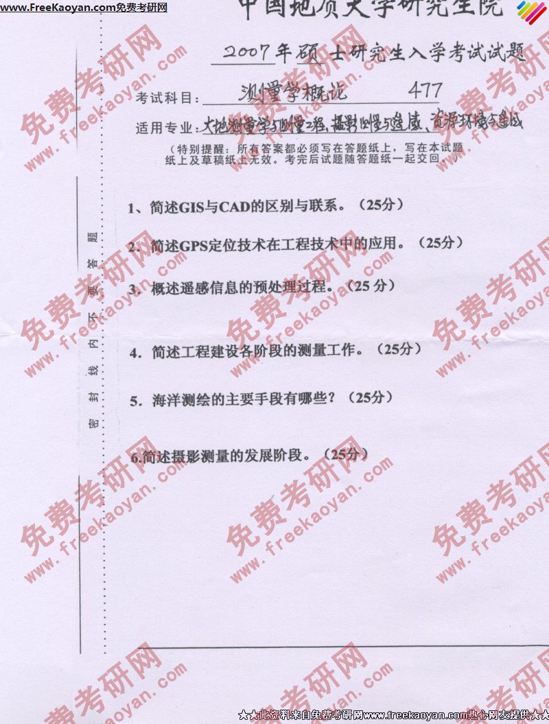 中国地质大学(武汉)2007年半岛在线注册真题-测量学概论