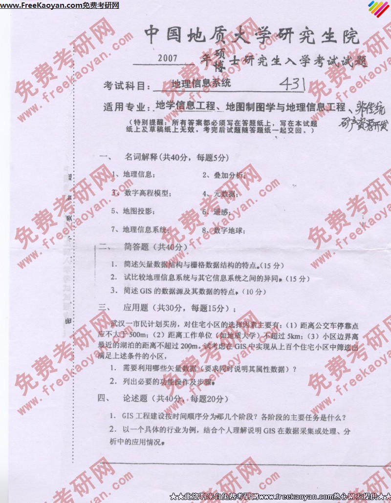 中国地质大学(武汉)2007年半岛在线注册真题-地理信息系统