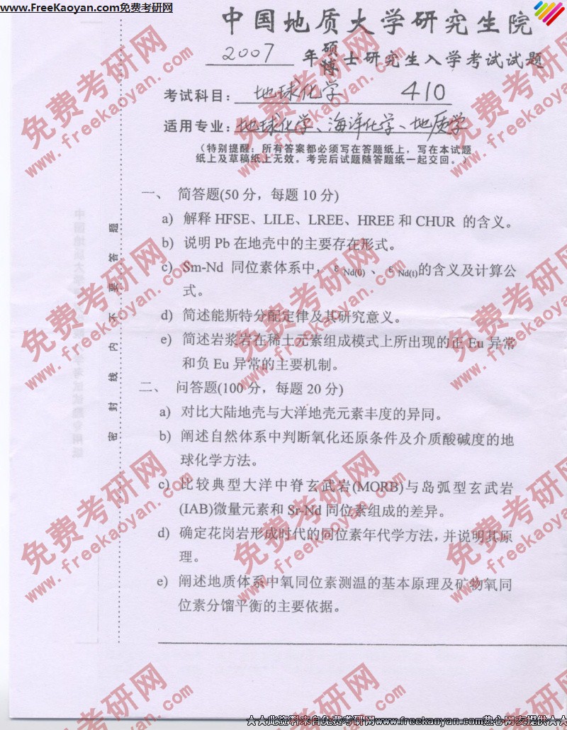 中国地质大学(武汉)2007年半岛在线注册真题-地球化学