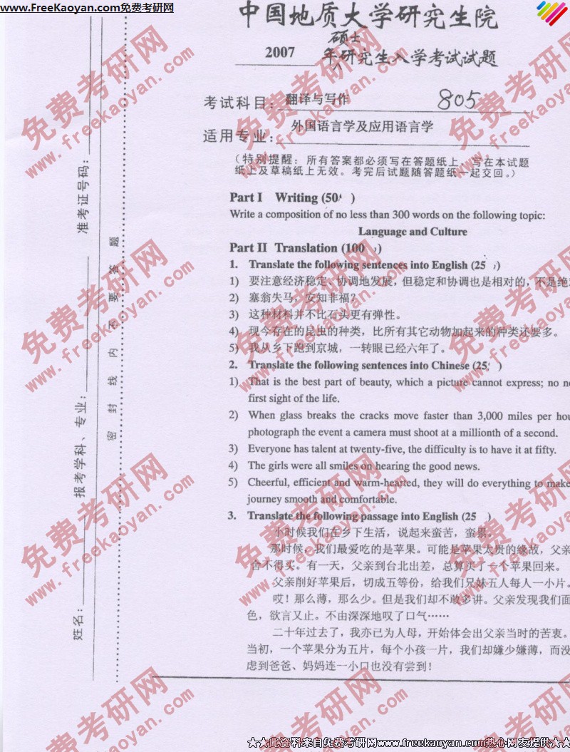 中国地质大学(武汉)2007年半岛在线注册真题-翻译与写作