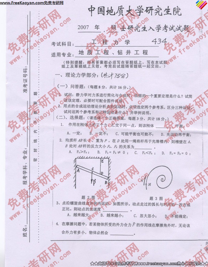 中国地质大学(武汉)2007年半岛在线注册真题-工程力学
