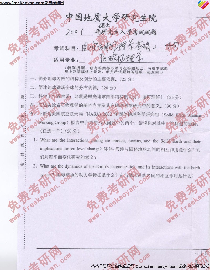 中国地质大学(武汉)2007年半岛在线注册真题-固体地球物理学基础