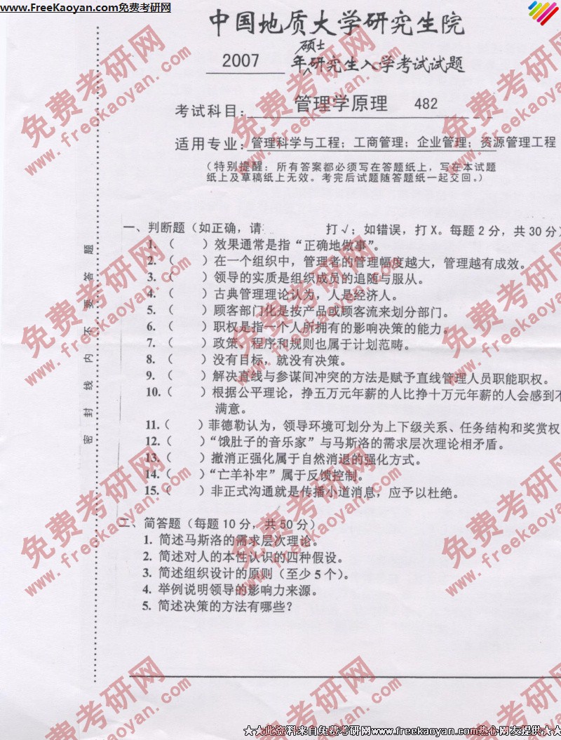 中国地质大学(武汉)2007年半岛在线注册真题-管理学原理