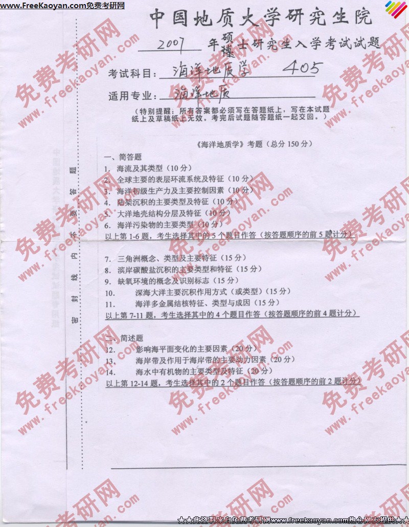 专业课半岛在线注册经验 本站小编 FreeKaoyan 2018-01-23中国地质大学(武汉)2007年半岛在线注册真题-海洋地球化学