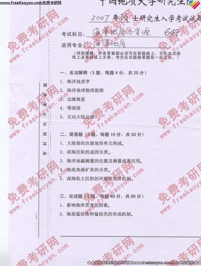 中国地质大学(武汉)2007年半岛在线注册真题-海洋地质与资源
