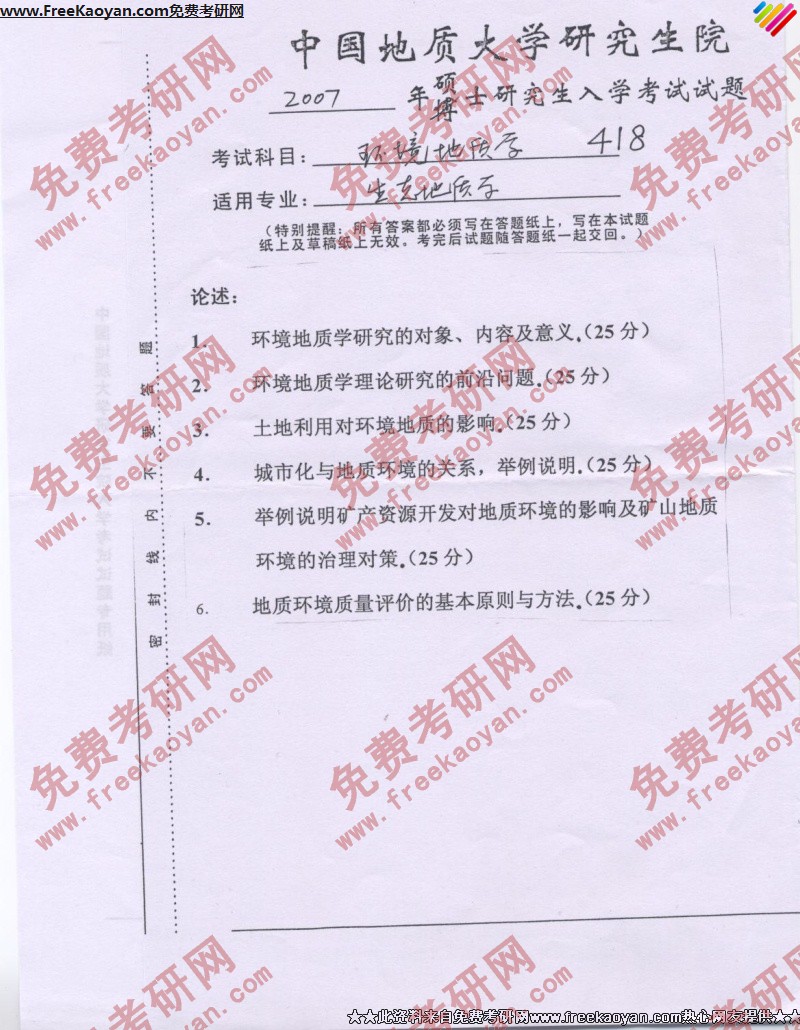 中国地质大学(武汉)2007年半岛在线注册真题-环境地质学