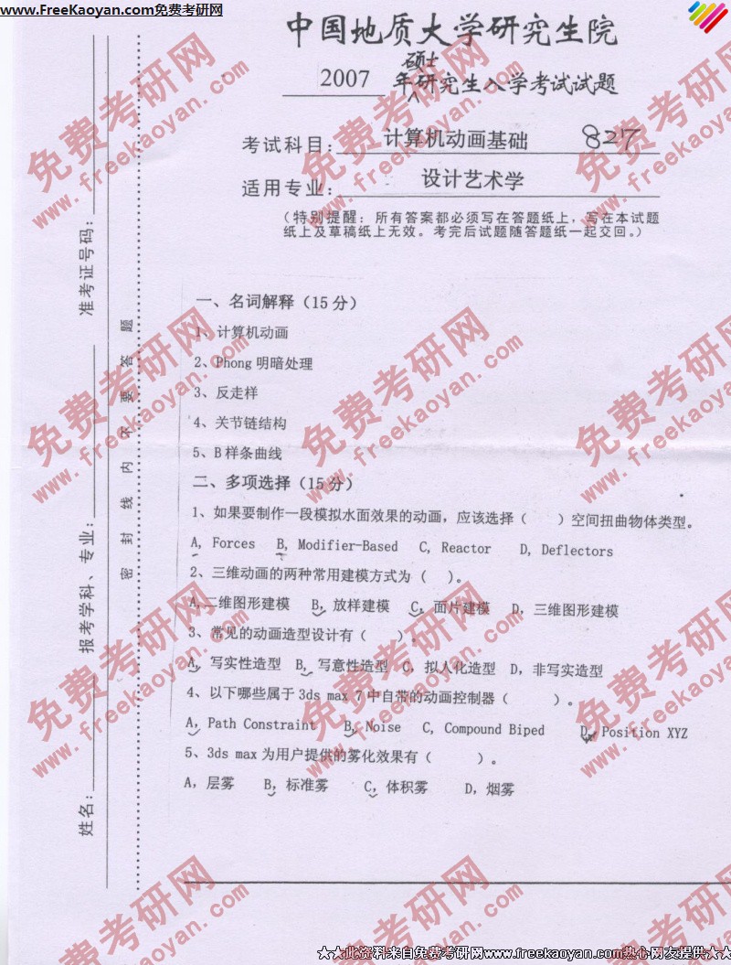 中国地质大学(武汉)2007年半岛在线注册真题-计算机动画基础