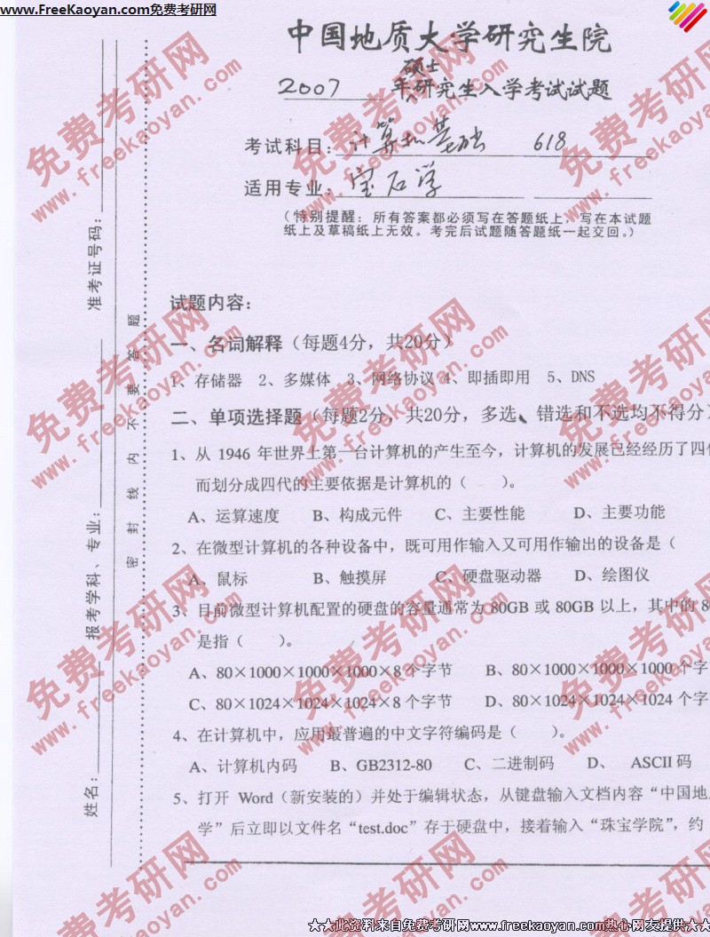 中国地质大学(武汉)2007年半岛在线注册真题-计算机基础