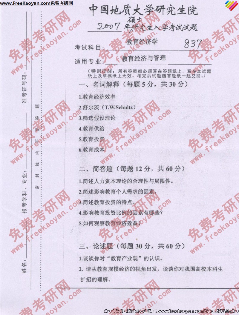 中国地质大学(武汉)2007年半岛在线注册真题-教育经济学