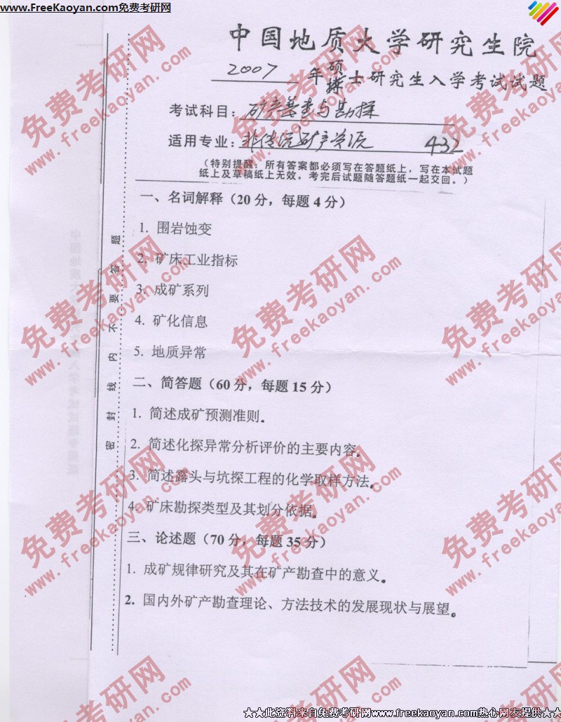 中国地质大学(武汉)2007年半岛在线注册真题-矿产普查与勘探