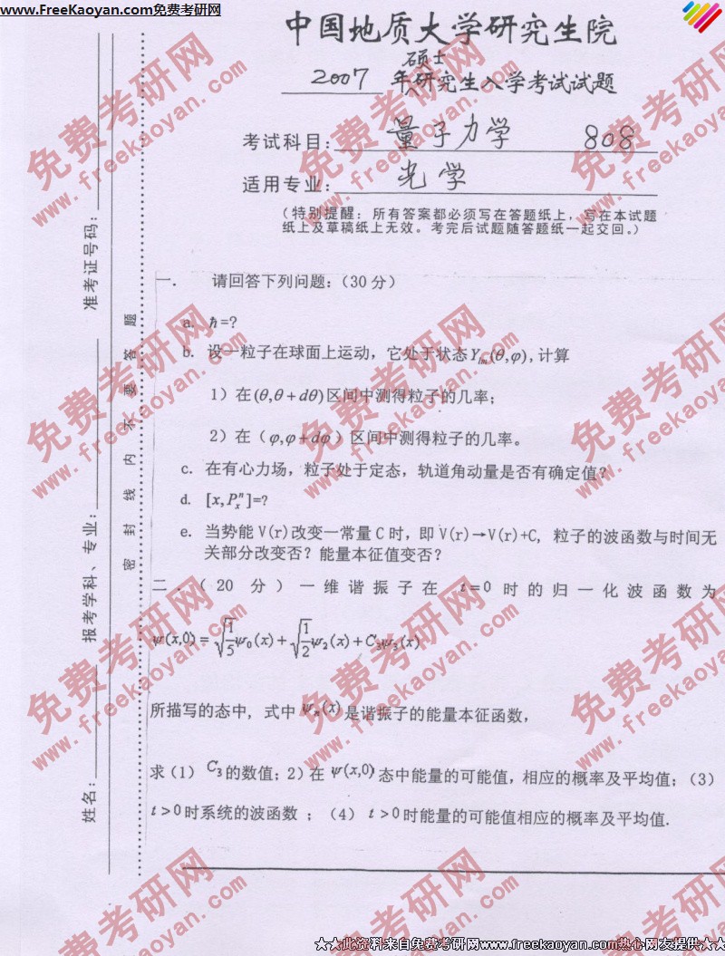 中国地质大学(武汉)2007年半岛在线注册真题-量子力学