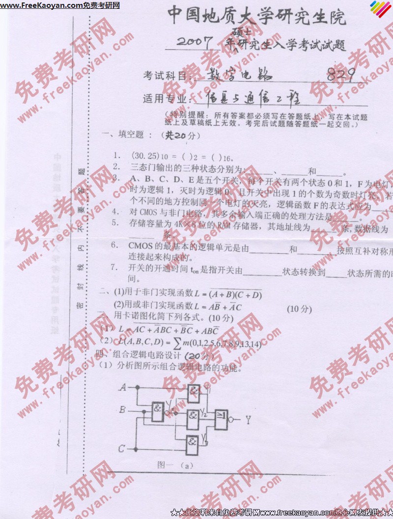 中国地质大学(武汉)2007年半岛在线注册真题-数字电路