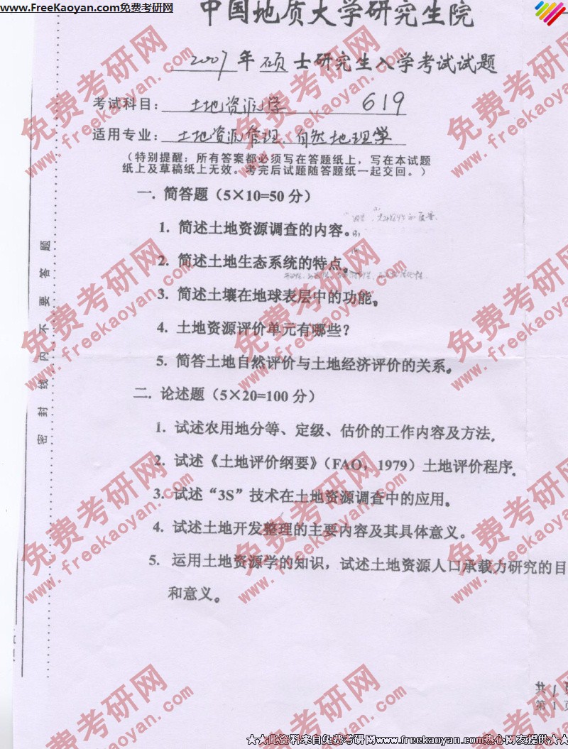 中国地质大学(武汉)2007年半岛在线注册真题-土地资源学