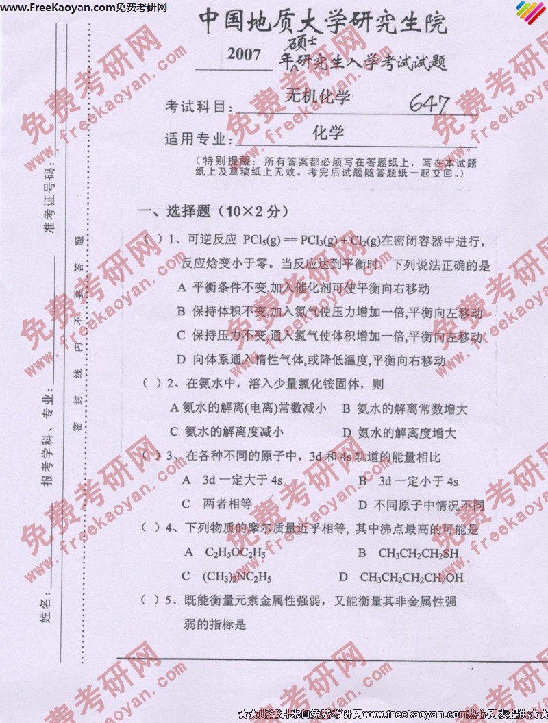 中国地质大学(武汉)2007年半岛在线注册真题-无机化学