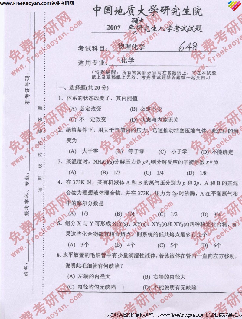 中国地质大学(武汉)2007年半岛在线注册真题-物理化学