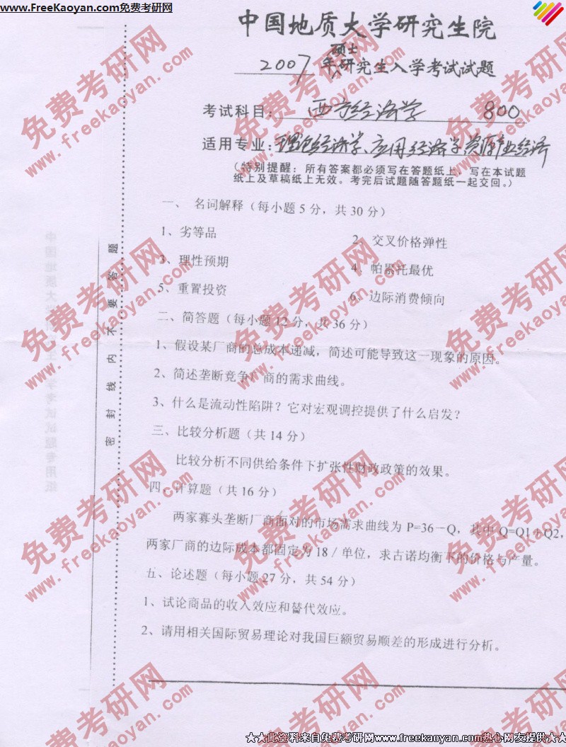 专业课半岛在线注册经验 本站小编 FreeKaoyan 2018-01-23中国地质大学(武汉)2007年半岛在线注册真题-微观经济学