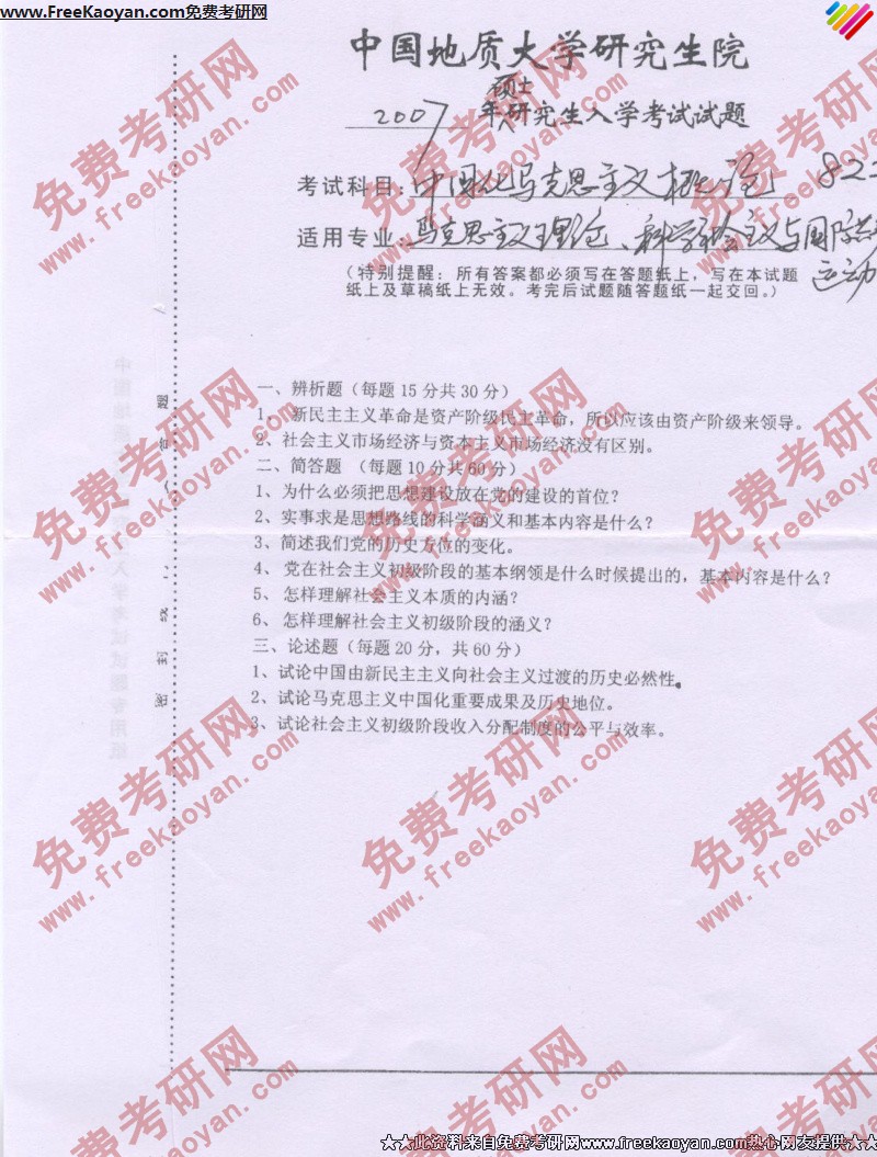 中国地质大学(武汉)2007年半岛在线注册真题-中国化马克思主义概论