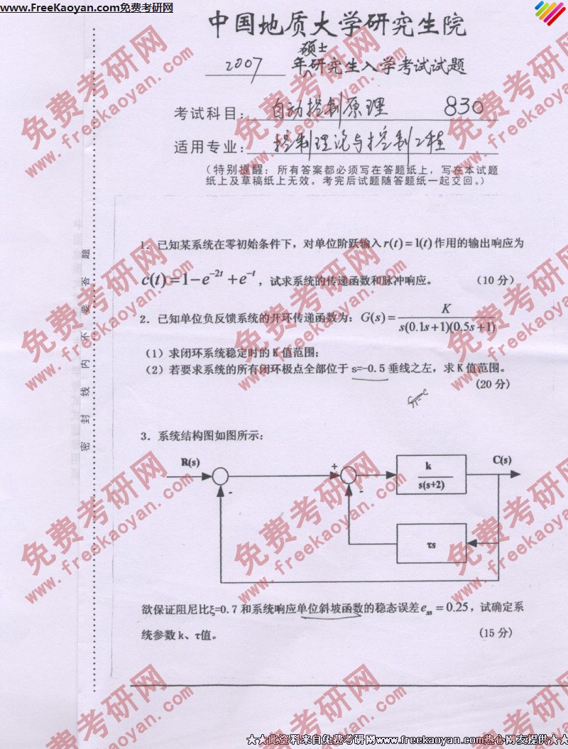 中国地质大学(武汉)2007年半岛在线注册真题-自动控制原理