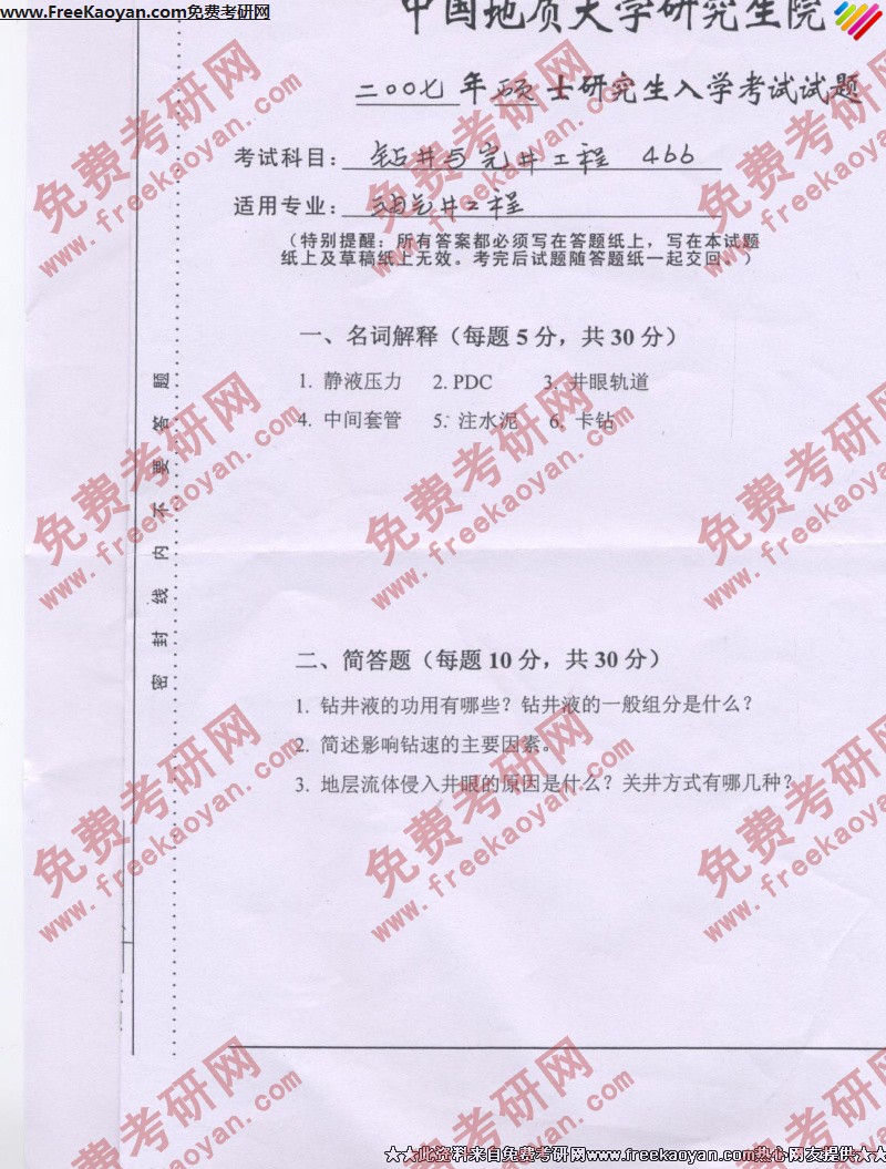 中国地质大学(武汉)2007年半岛在线注册真题-钻井与完井工程