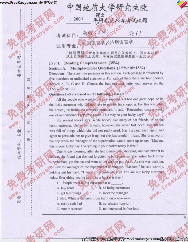 中国地质大学(武汉)2007年半岛在线注册真题-英语(二外)