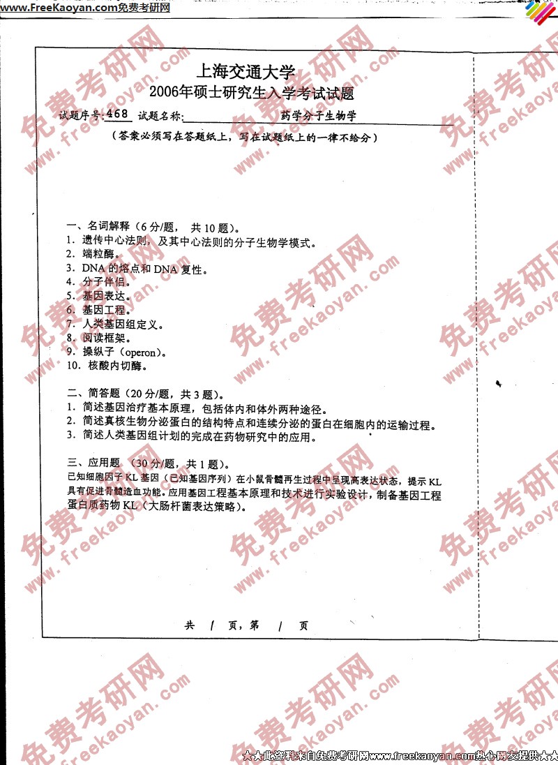 上海交通大学2006年半岛在线注册真题-药学分子生物学