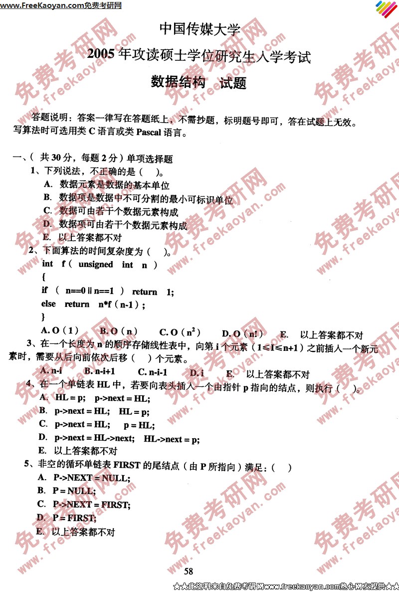 中国传媒大学2005年半岛在线注册真题-数据结构