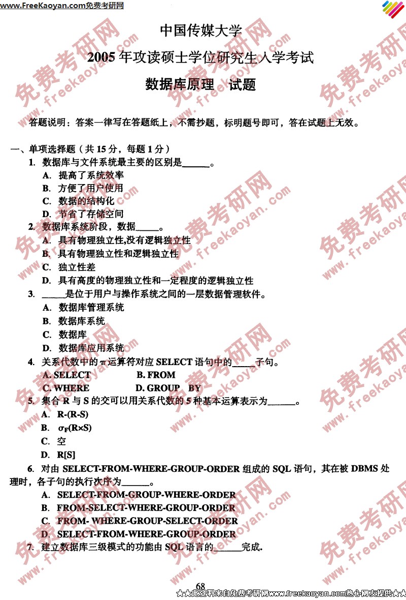 专业课半岛在线注册经验 本站小编 FreeKaoyan 2018-01-23中国传媒大学2005年半岛在线注册真题-软件工程和数据库原理