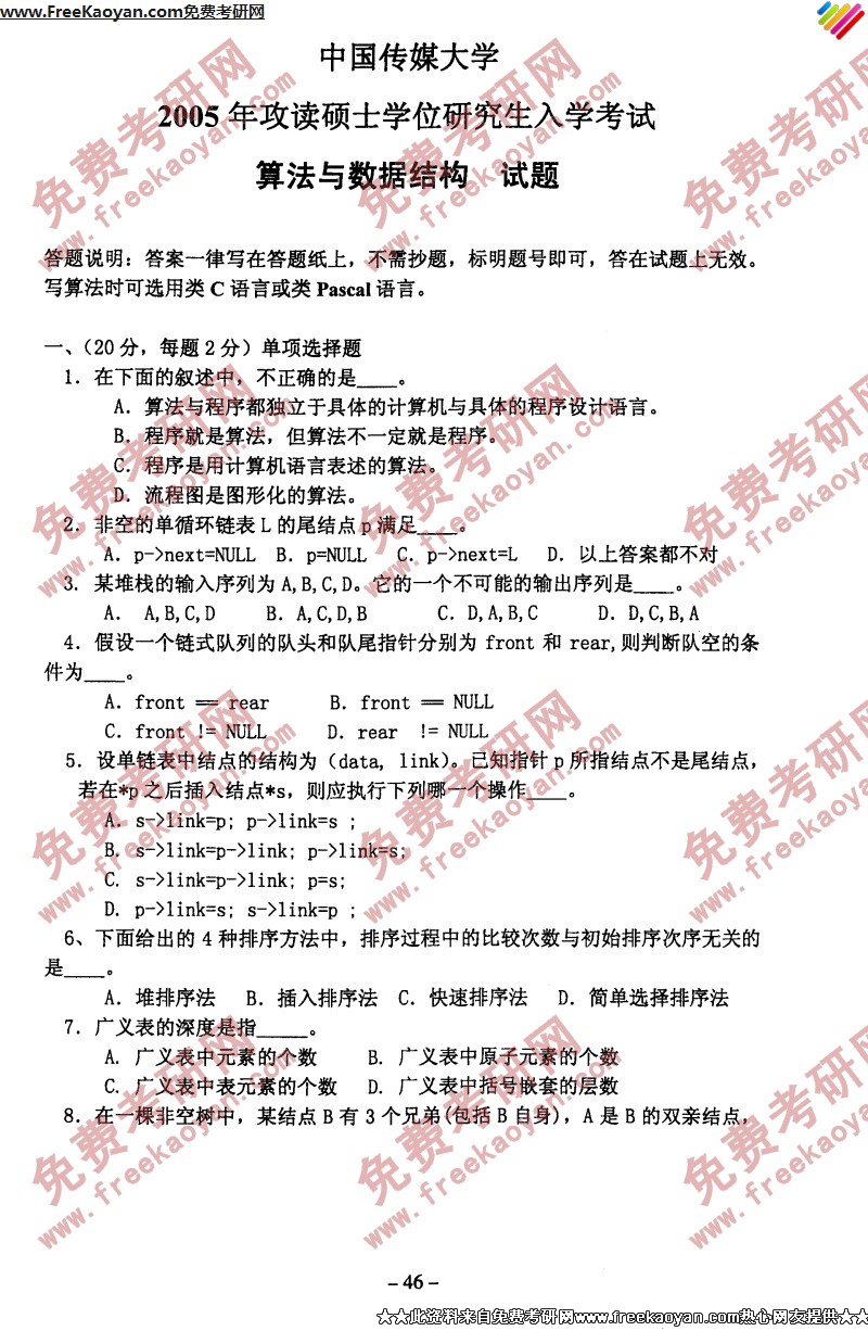专业课半岛在线注册经验 本站小编 FreeKaoyan 2018-01-23中国传媒大学2005年半岛在线注册真题-数据结构