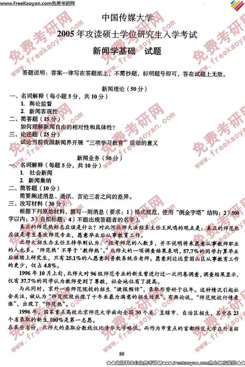 中国传媒大学2005年半岛在线注册真题-新闻学基础