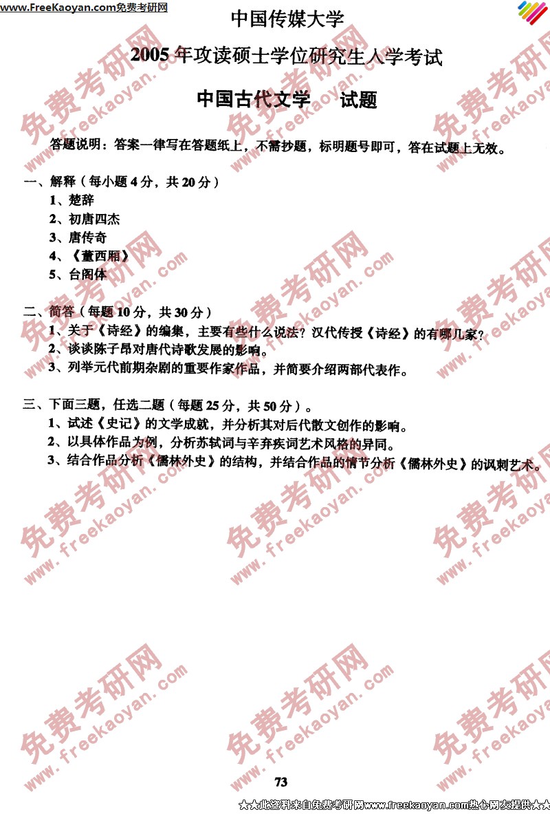 中国传媒大学2005年半岛在线注册真题-中国古代文学