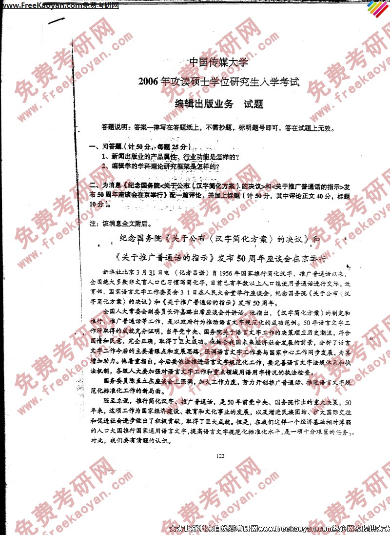中国传媒大学2006年半岛在线注册真题-编辑出版业务