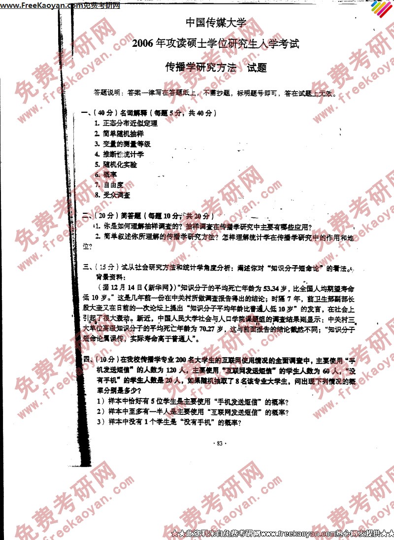 中国传媒大学2006年半岛在线注册真题-传播学研究方法