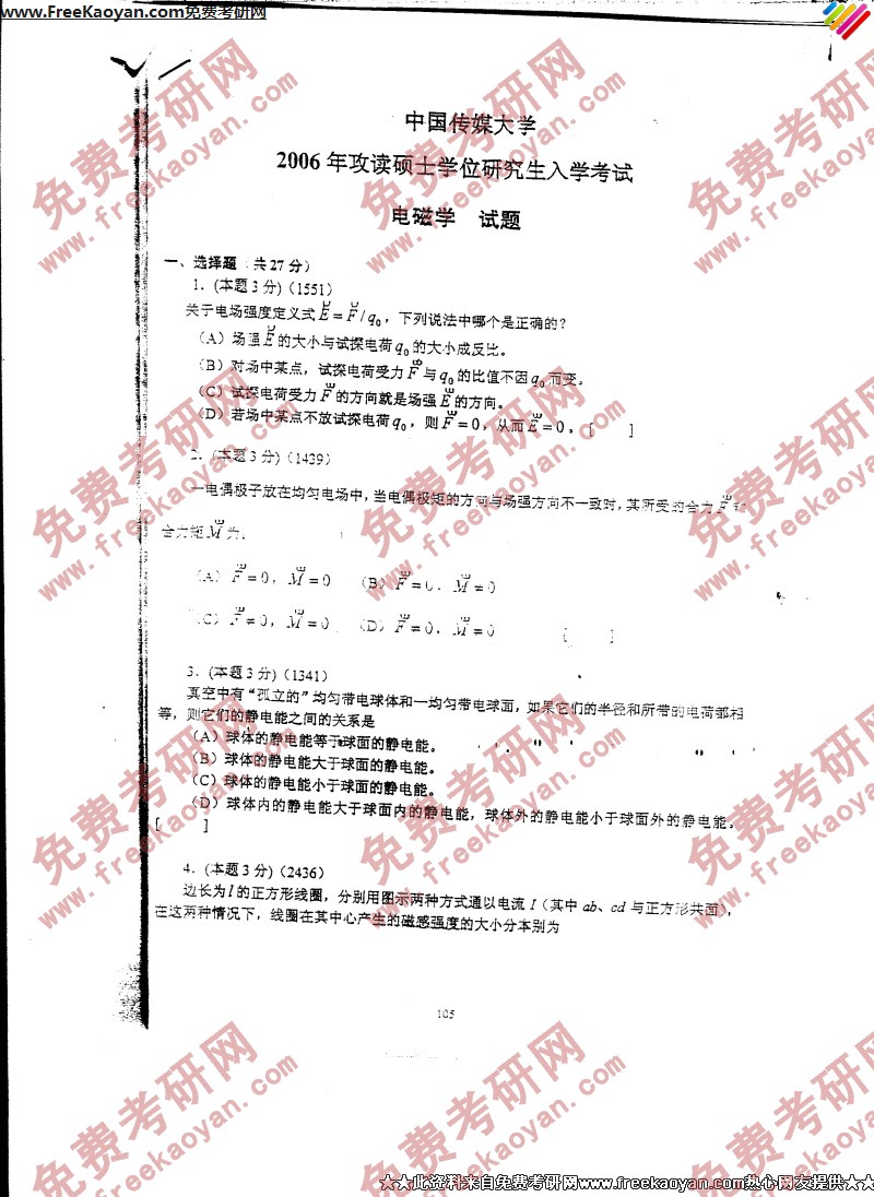 中国传媒大学2006年半岛在线注册真题-电磁学