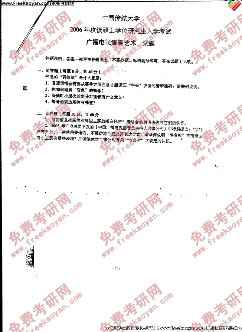 中国传媒大学2006年半岛在线注册真题-广播电视语言艺术