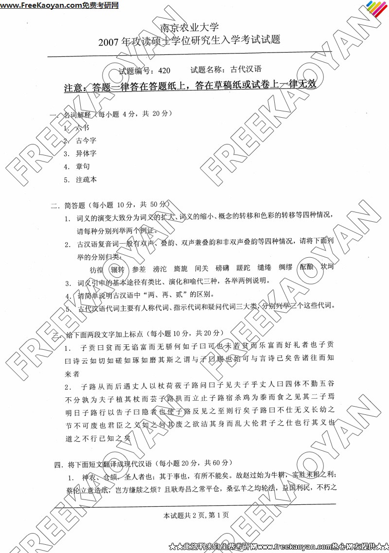 南京农业大学2007年半岛在线注册真题-古代汉语
