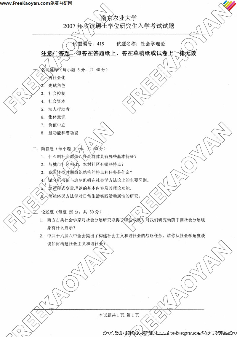 南京农业大学2007年半岛在线注册真题-社会学理论