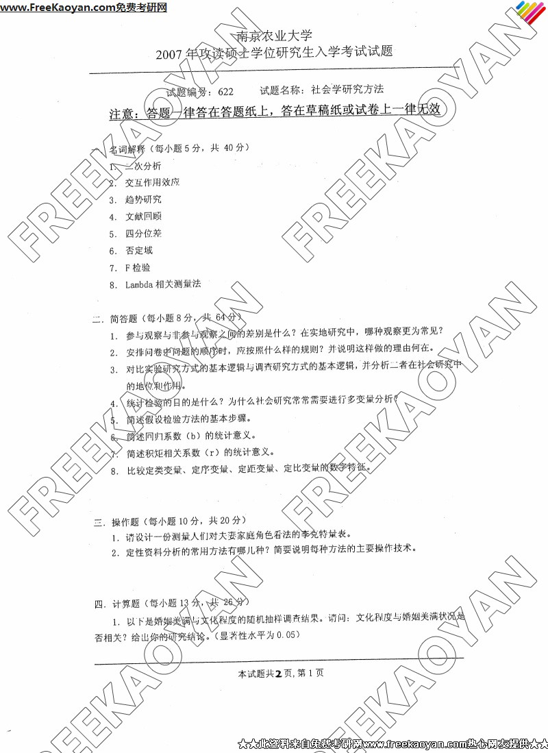 南京农业大学2007年半岛在线注册真题-社会学研究方法