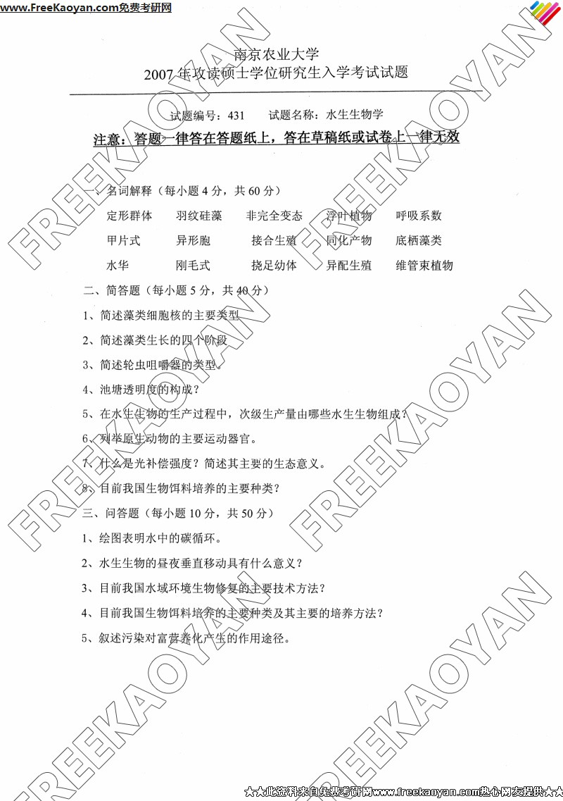 南京农业大学2007年半岛在线注册真题-水生生物学