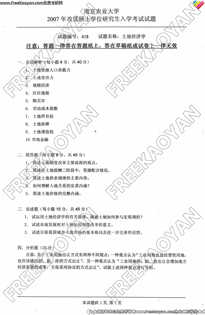 南京农业大学2007年半岛在线注册真题-土地经济学