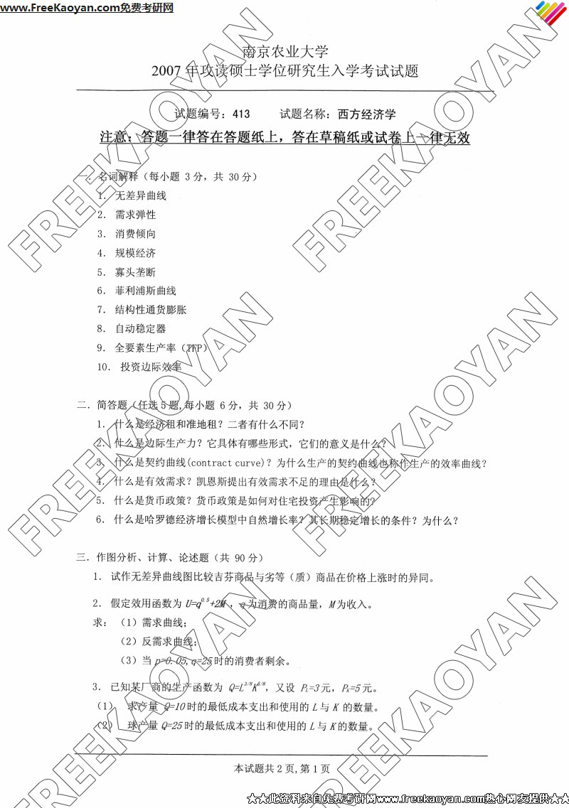 南京农业大学2007年半岛在线注册真题-西方经济学