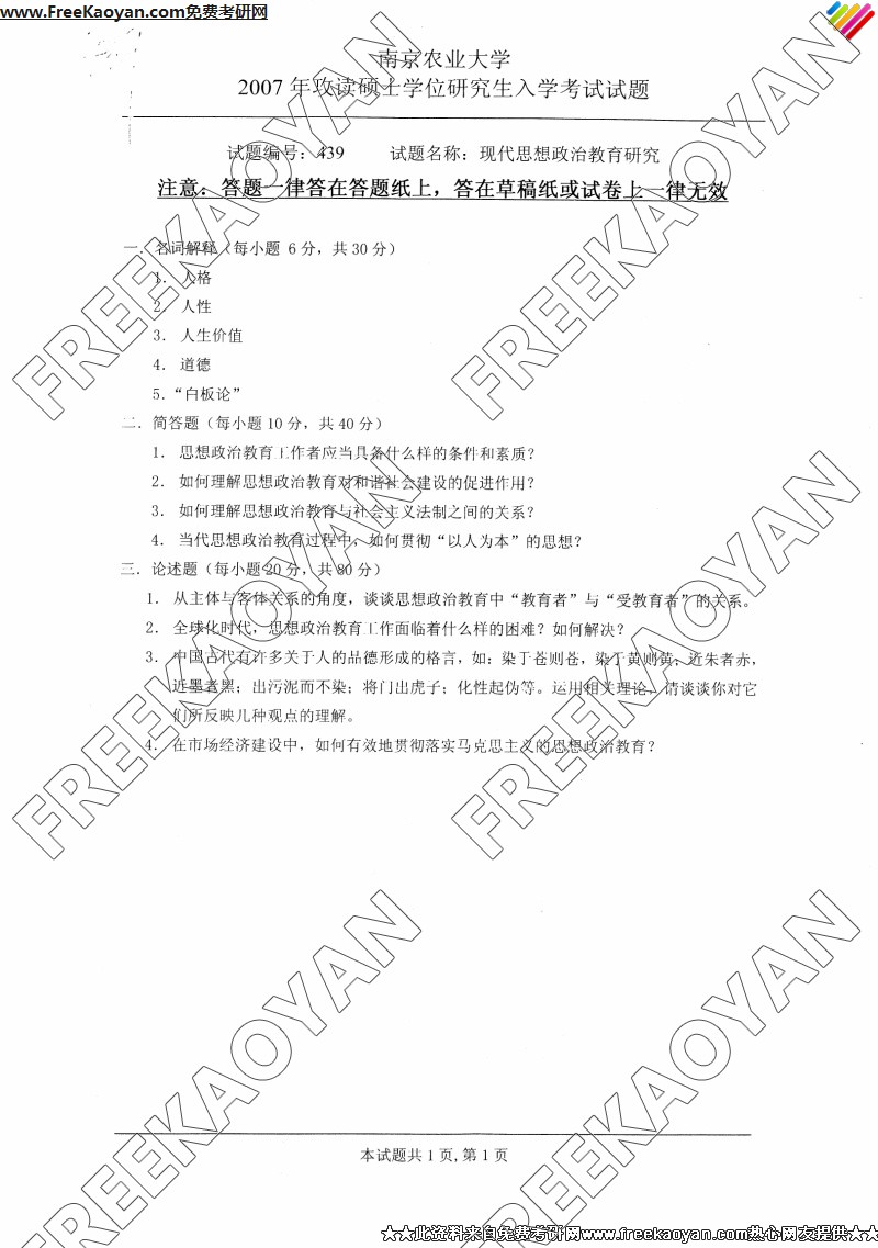 南京农业大学2007年半岛在线注册真题-现代思想政治教育研究