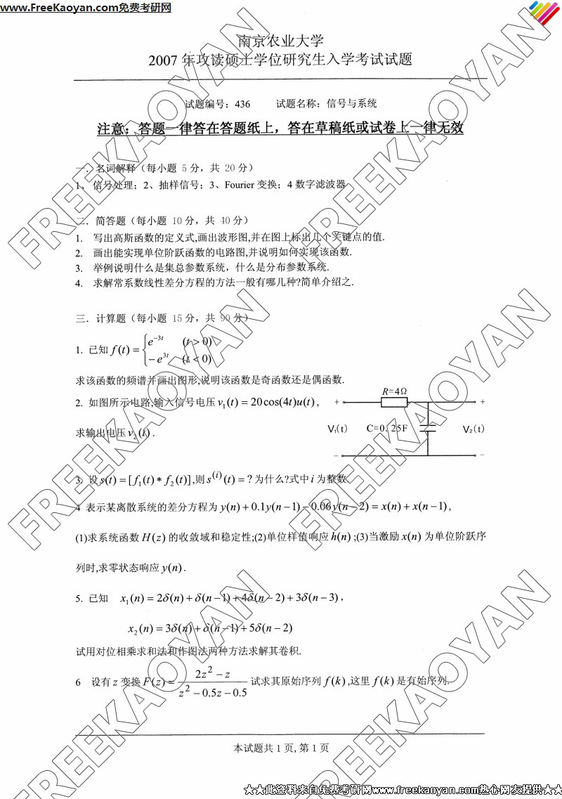 南京农业大学2007年半岛在线注册真题-信号与系统