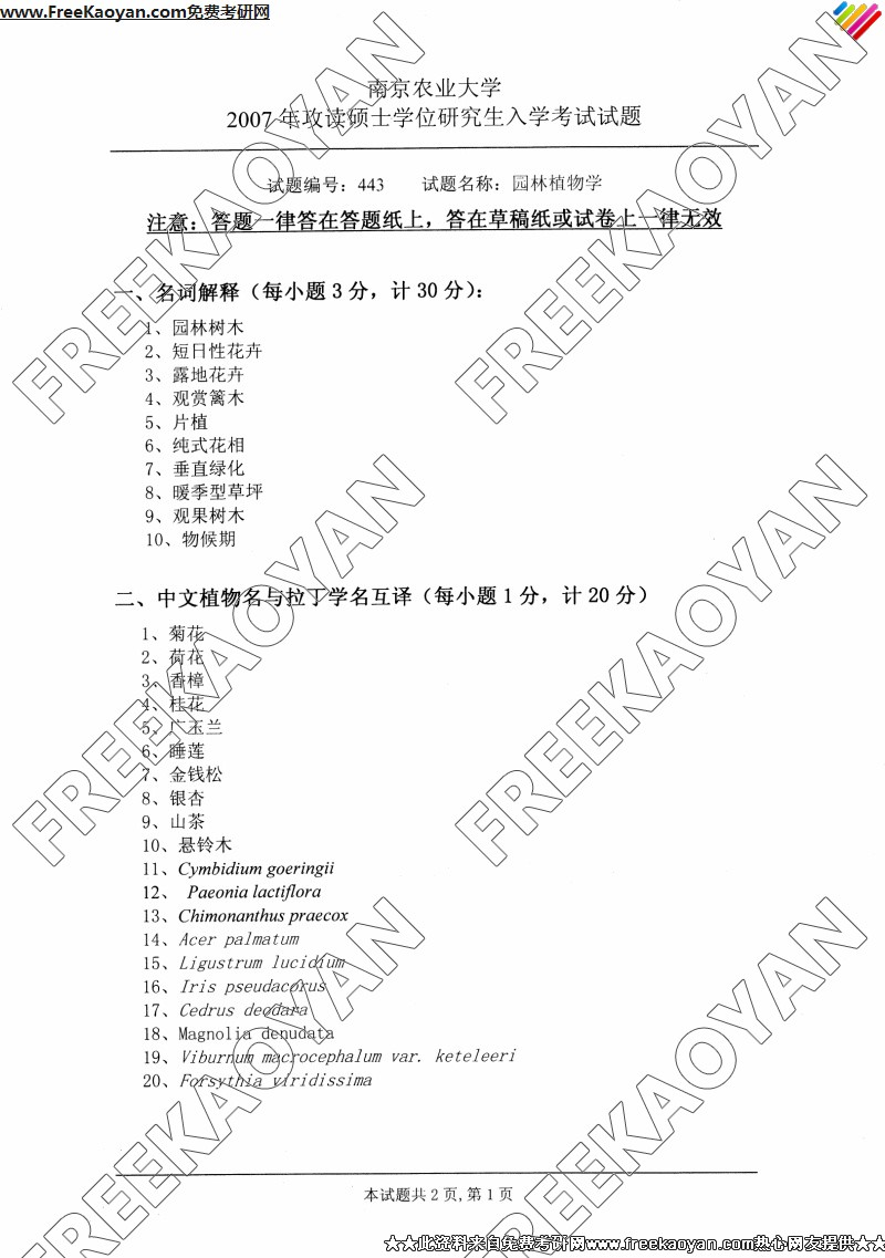 南京农业大学2007年半岛在线注册真题-园林植物学