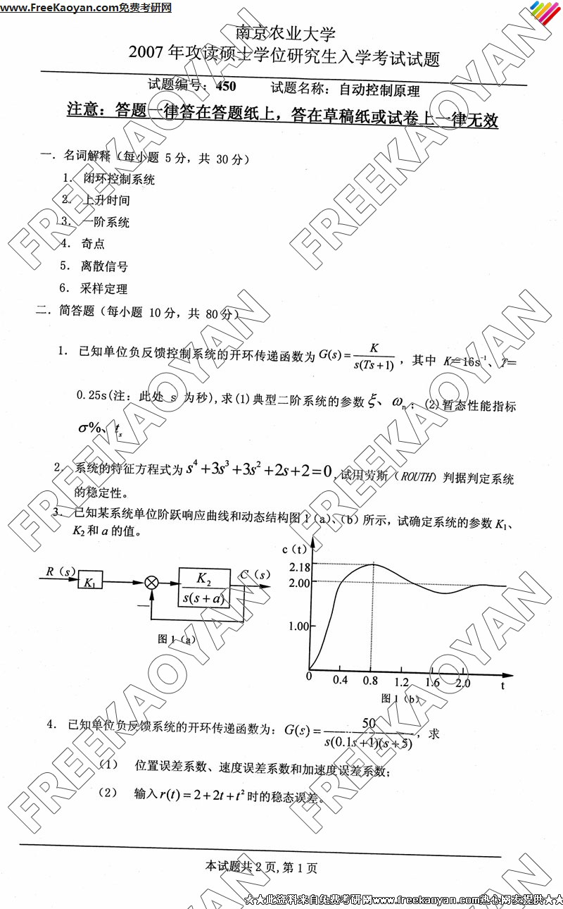 南京农业大学2007年半岛在线注册真题-自动控制原理