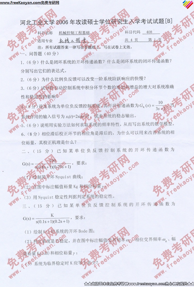 河北工业大学2006年半岛在线注册真题-机械控制工程基础B