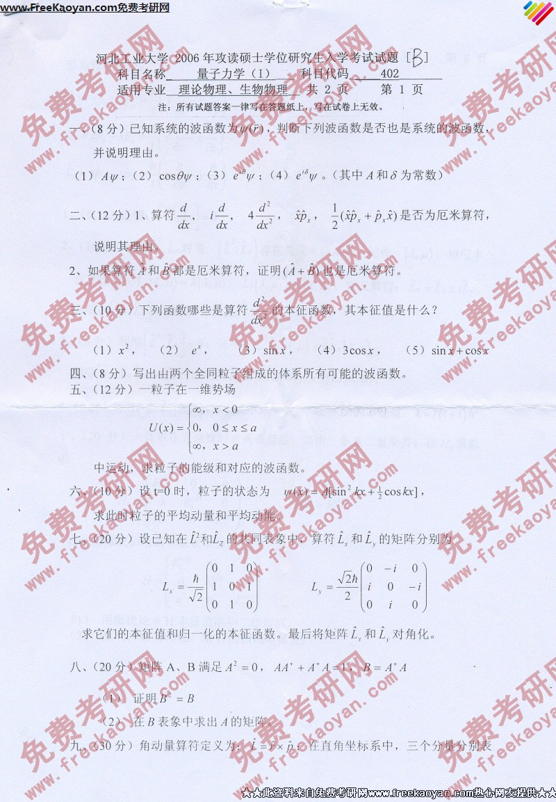 河北工业大学2006年半岛在线注册真题-量子力学1