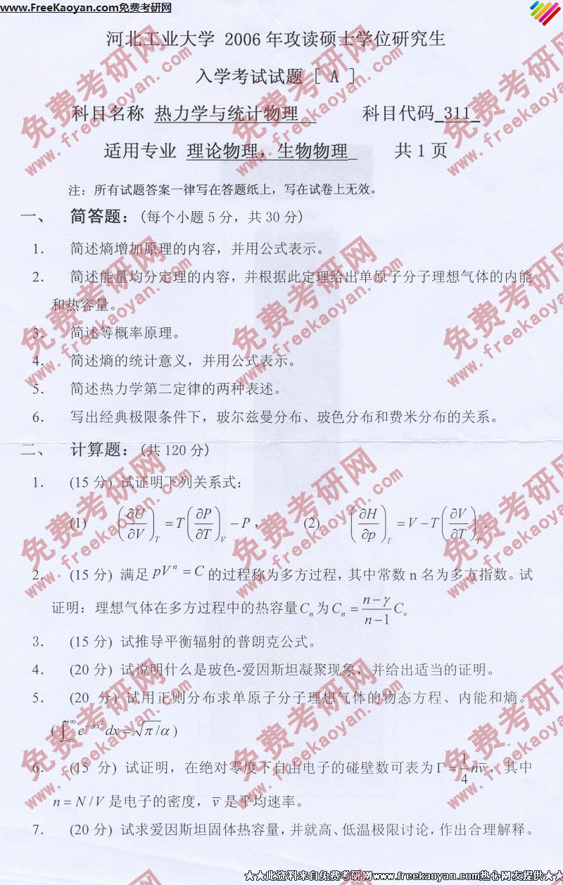 河北工业大学2006年半岛在线注册真题-热力学与统计物理