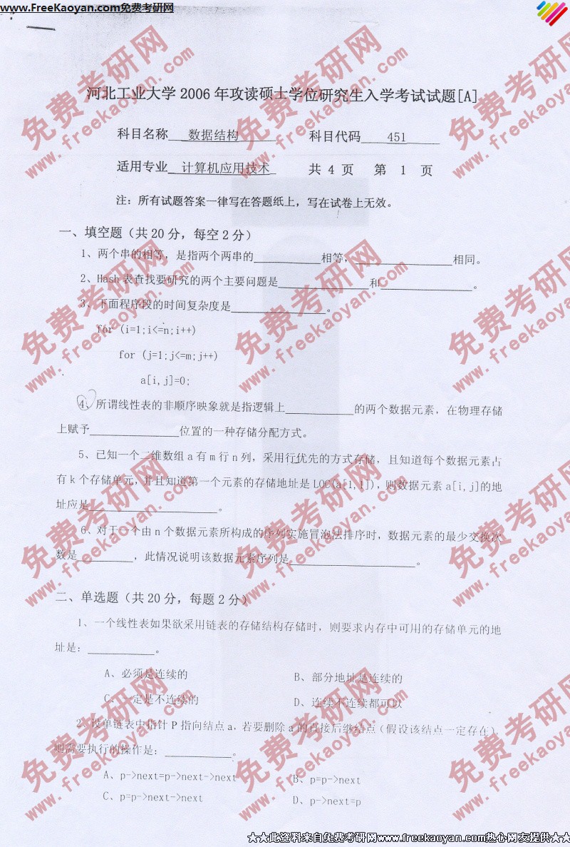河北工业大学2006年半岛在线注册真题-数据结构