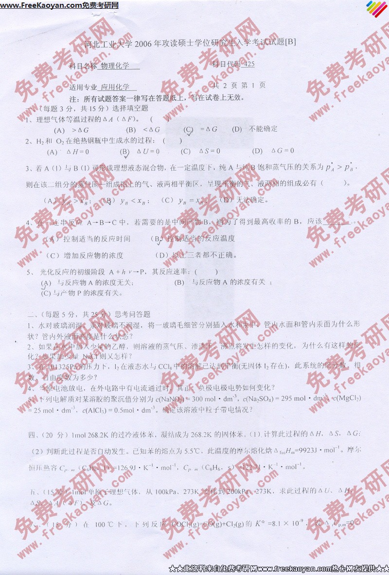 专业课半岛在线注册经验 本站小编 FreeKaoyan 2018-01-23河北工业大学2006年半岛在线注册真题-物理化学2
