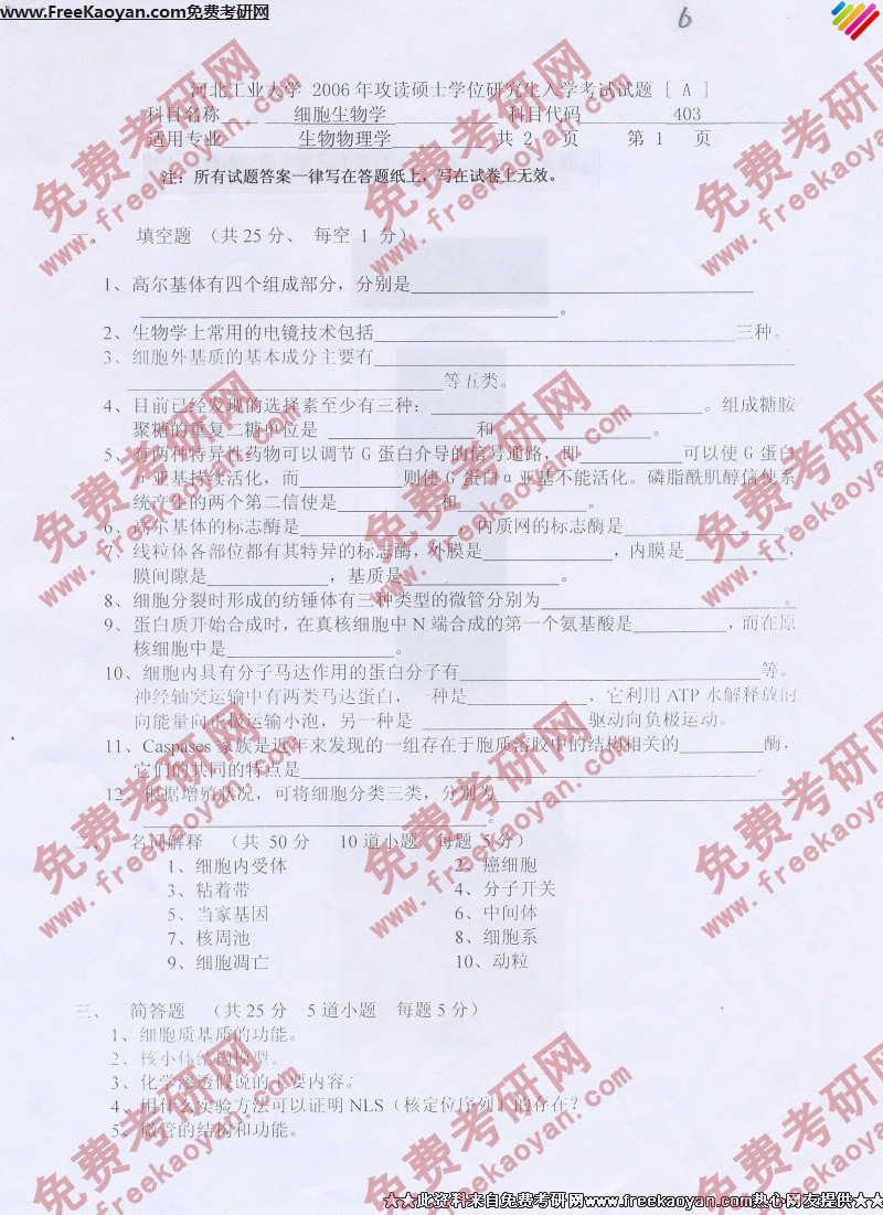 河北工业大学2006年半岛在线注册真题-细胞生物学